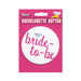 White, 3 inches diameter "bride to be" button. From Kalan.