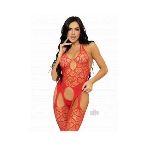 Out of stockSeamless heart net suspender bodystocking. O/S RED