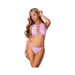 From the Exposed by Magic Silk collection, this style includes: A halter mesh bralette featuring blacklight reactive retro daisy print, looped elastic detail with bright lilac elastics, daisy beads, swan hook closure at the neck, hook & eye closure at the back, and a matching cheeky panty.