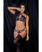 This vibrant nocturnal flower print contrasts perfectly with this soft black lace. Top with cross detail, underwire and adjustable straps, matching jockstrap bottom with open back.